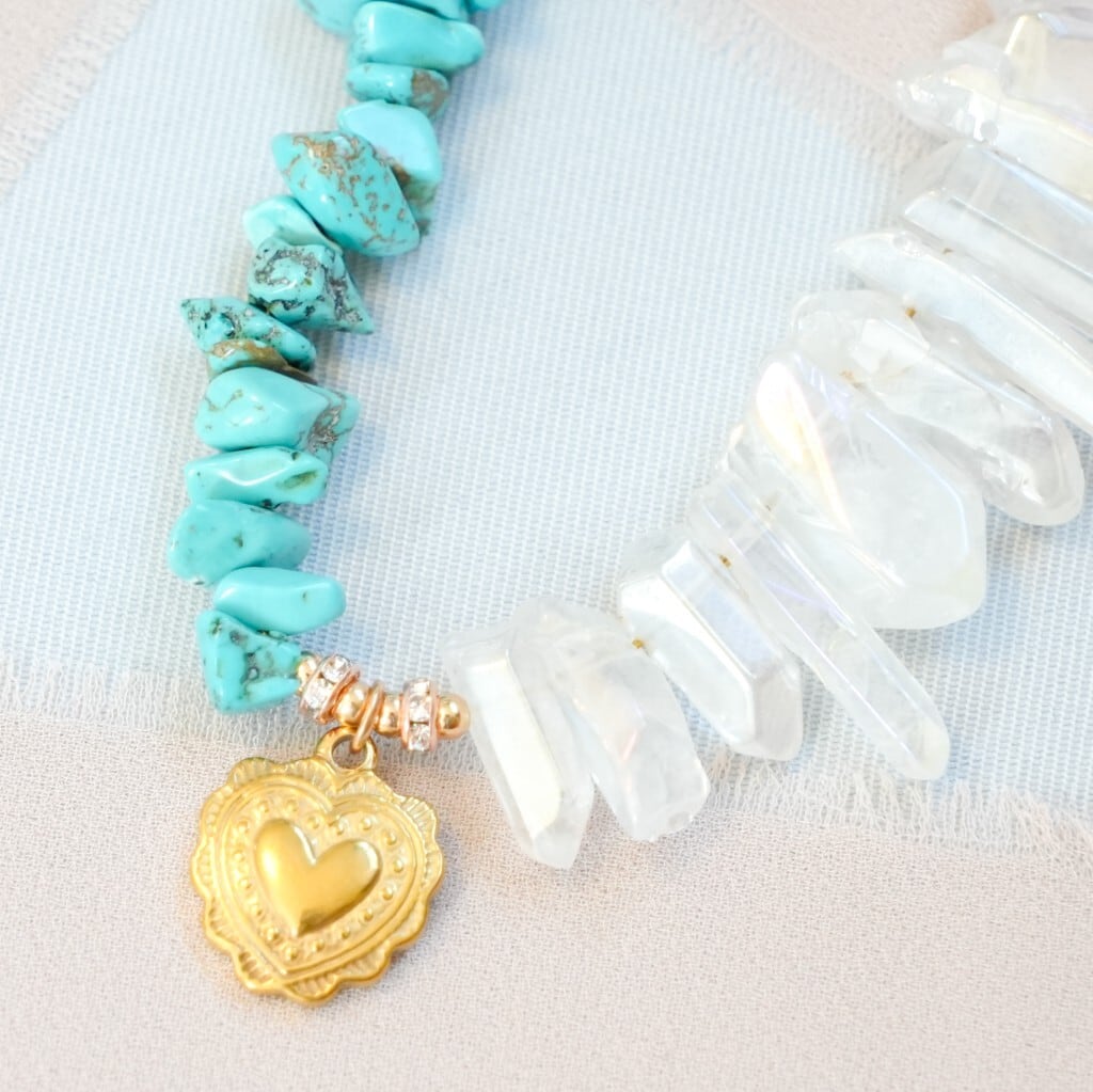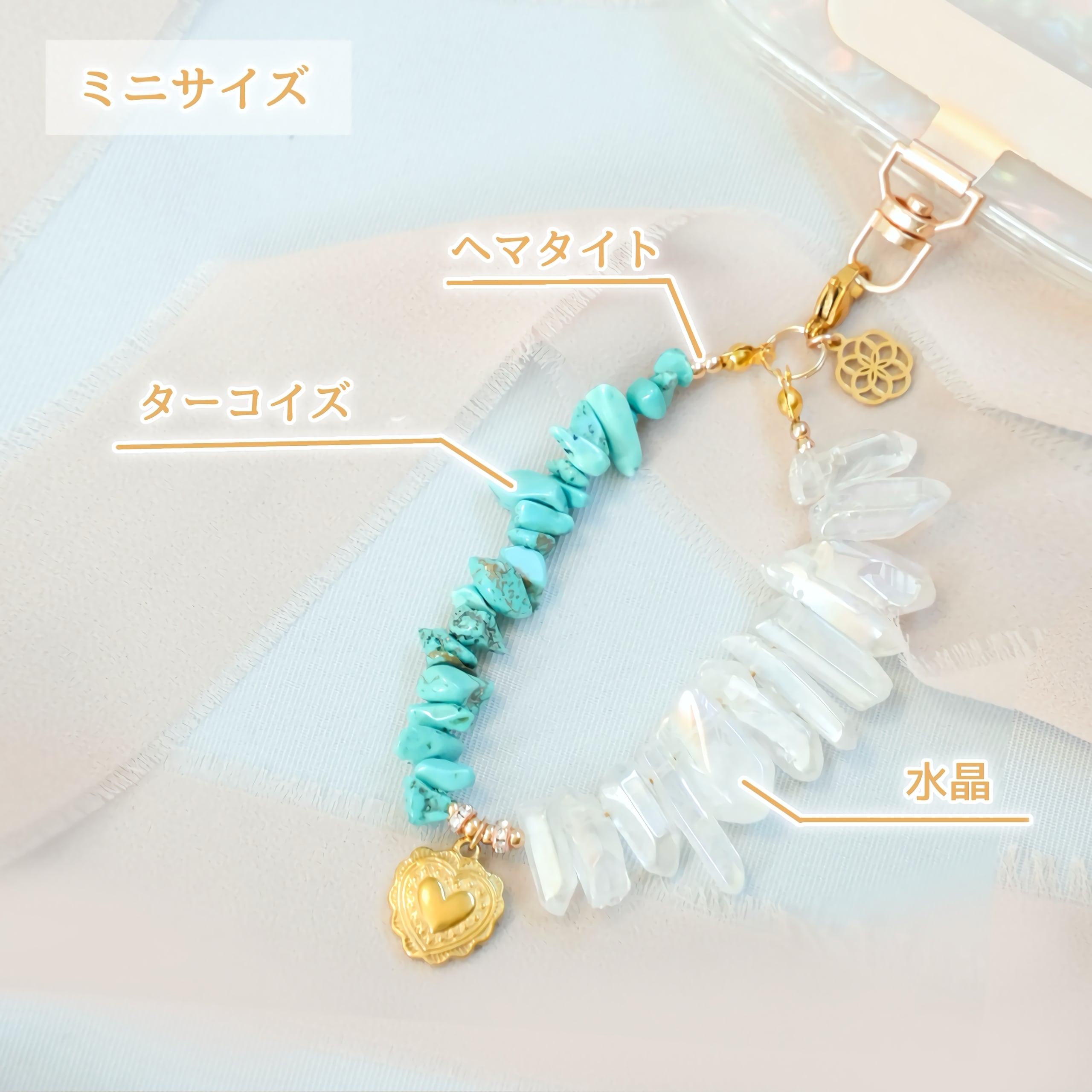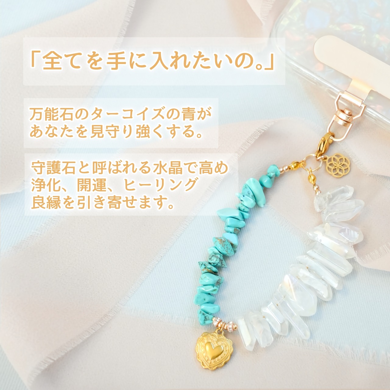 ターコイズの鮮やかなブルーと水晶の柔らかな光が、持つ人に守護と癒しを与え、旅や日常を安心して楽しめるお守りとなります。