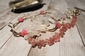 ストロベリークォーツと、大粒の水晶、小粒シェルを組み合わせた、贅沢な2連スマホストラップ。