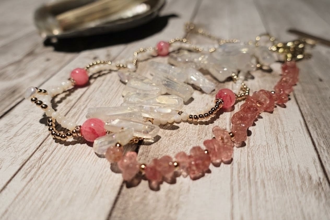 持ち主のエネルギーをクリアにし、集中力や直感力を高めます。さらに他の天然石のパワーを増幅させる効果があり、ストロベリークォーツやシェルの魅力を最大限に引き出します。災いや悪縁を遠ざけ、ポジティブなエネルギーを呼び込む守護石としても人気です。
