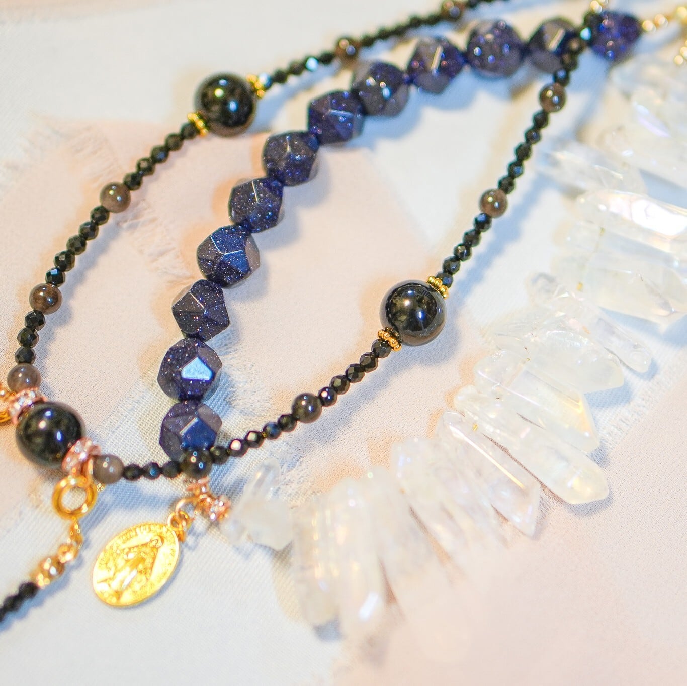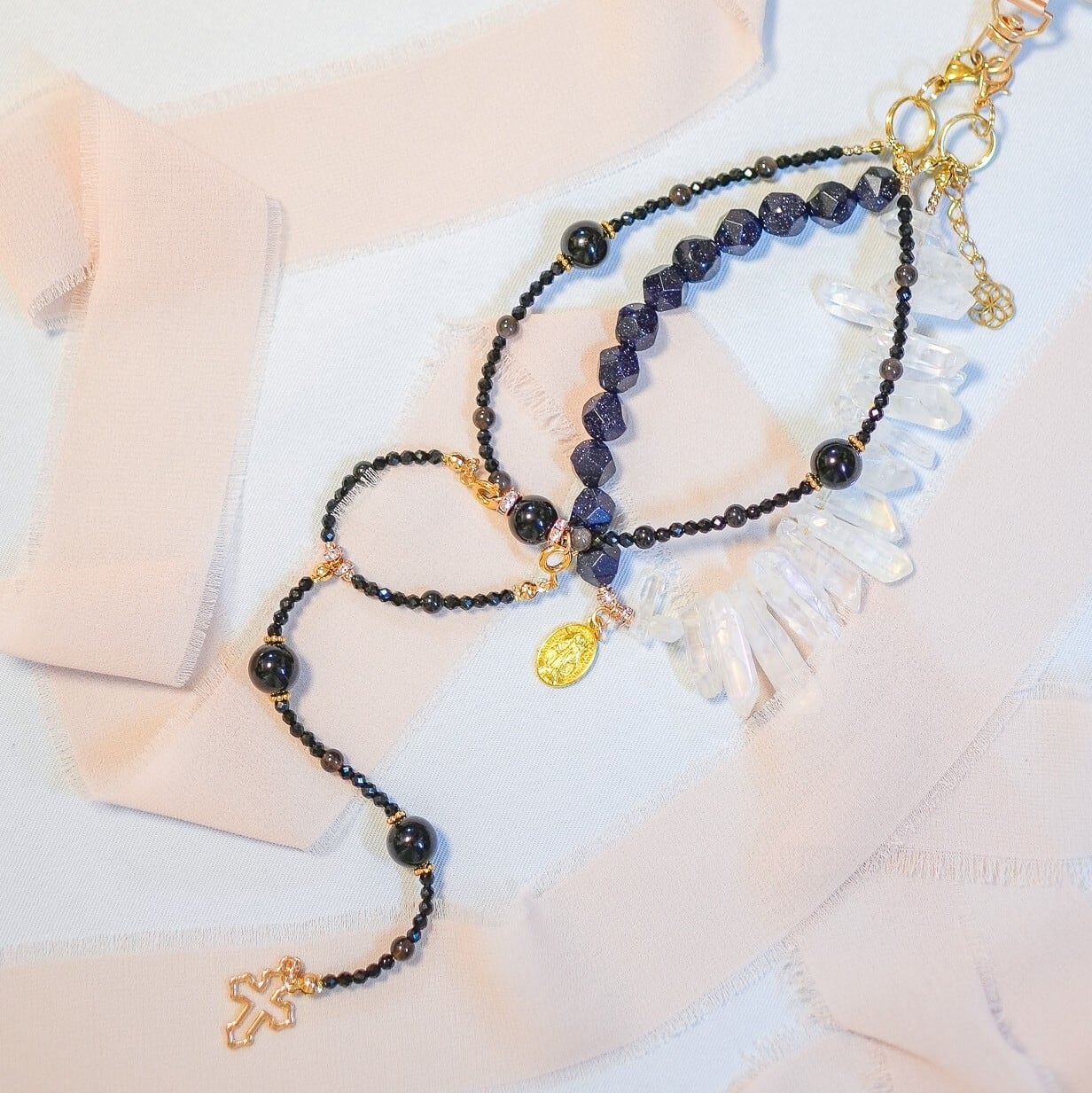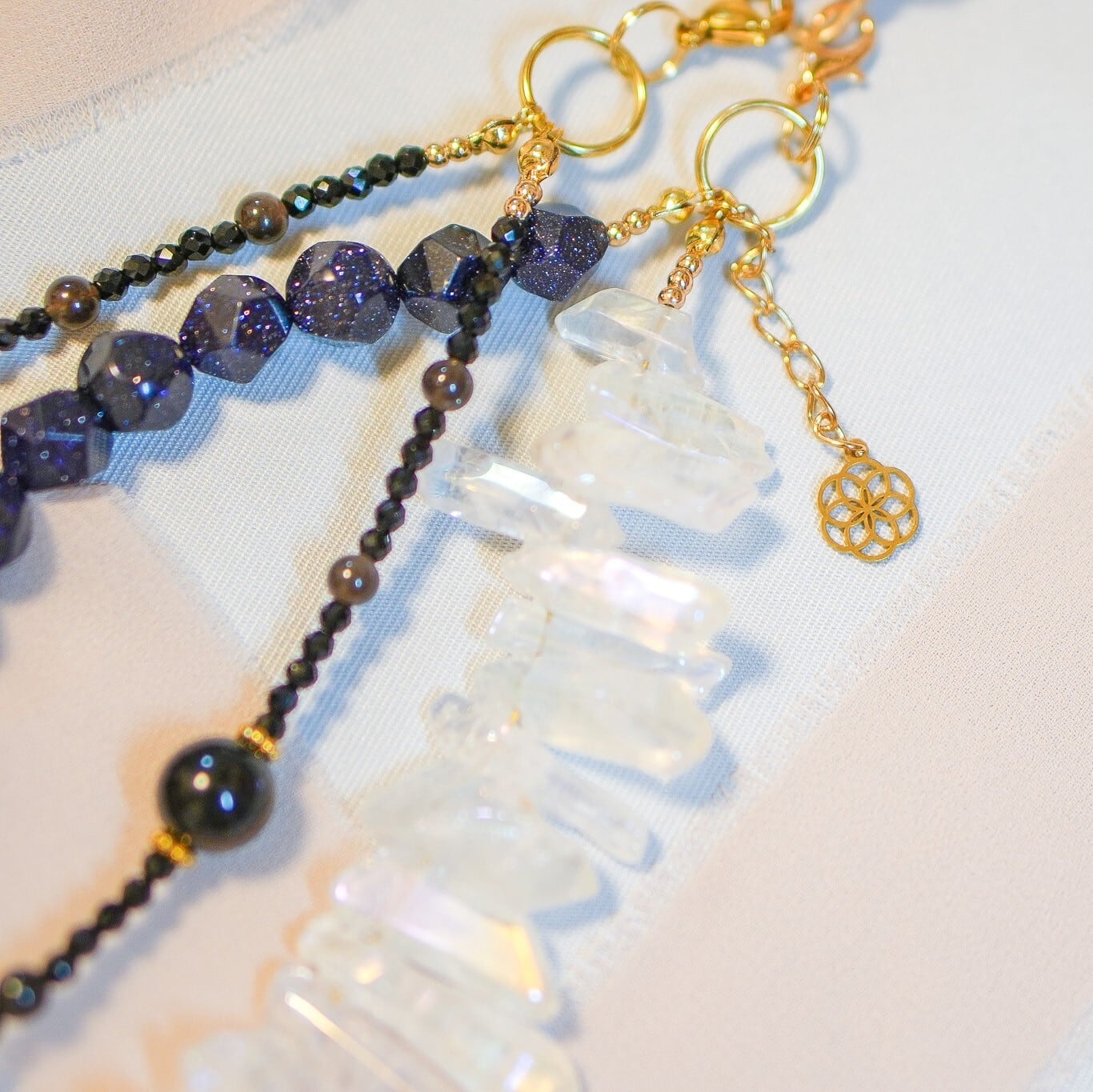 深いネイビーに星屑のような煌めきを秘めたサンドストーンをメインに、水晶の透明な輝き、漆黒のブラックオニキス、そしてモリオンやシルバーオブシディアンを重ねた、力強く荘厳なデザイン。