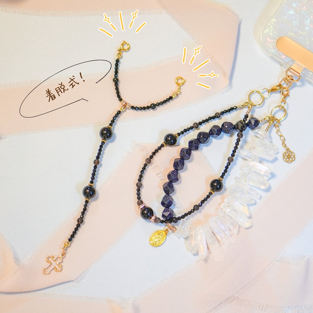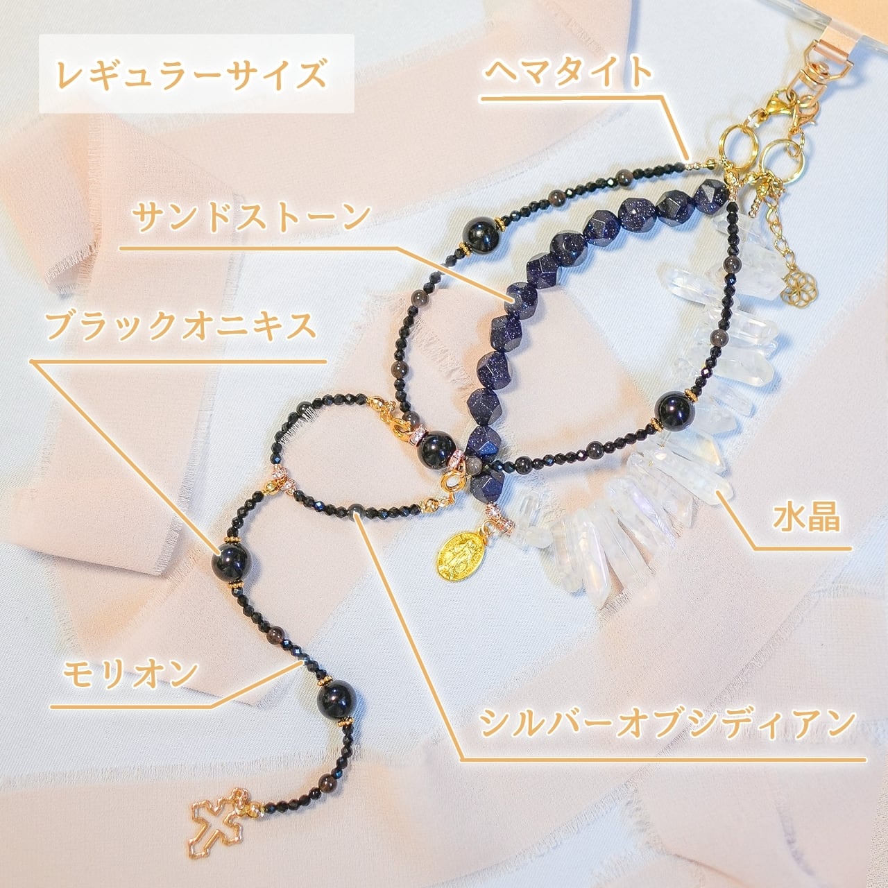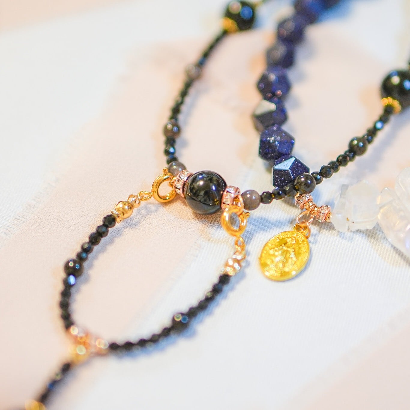 深いネイビーに星屑のような煌めきを秘めたサンドストーンをメインに、水晶の透明な輝き、漆黒のブラックオニキス、そしてモリオンやシルバーオブシディアンを重ねた、力強く荘厳なデザイン。