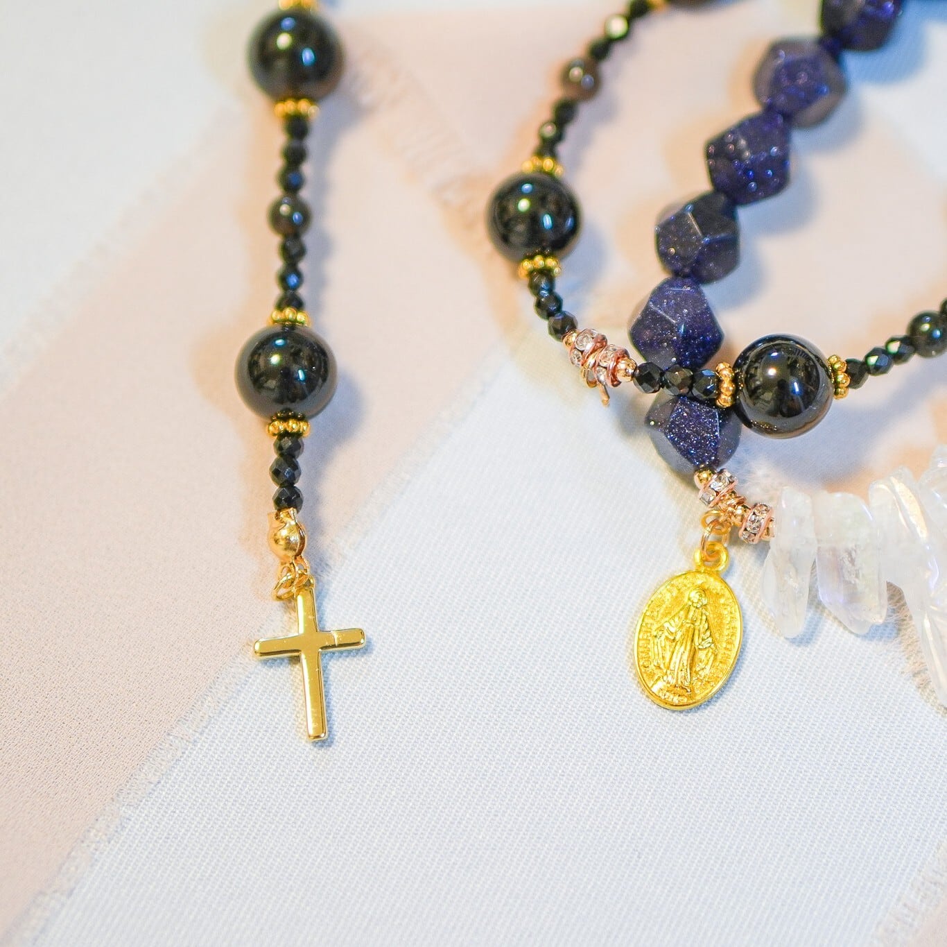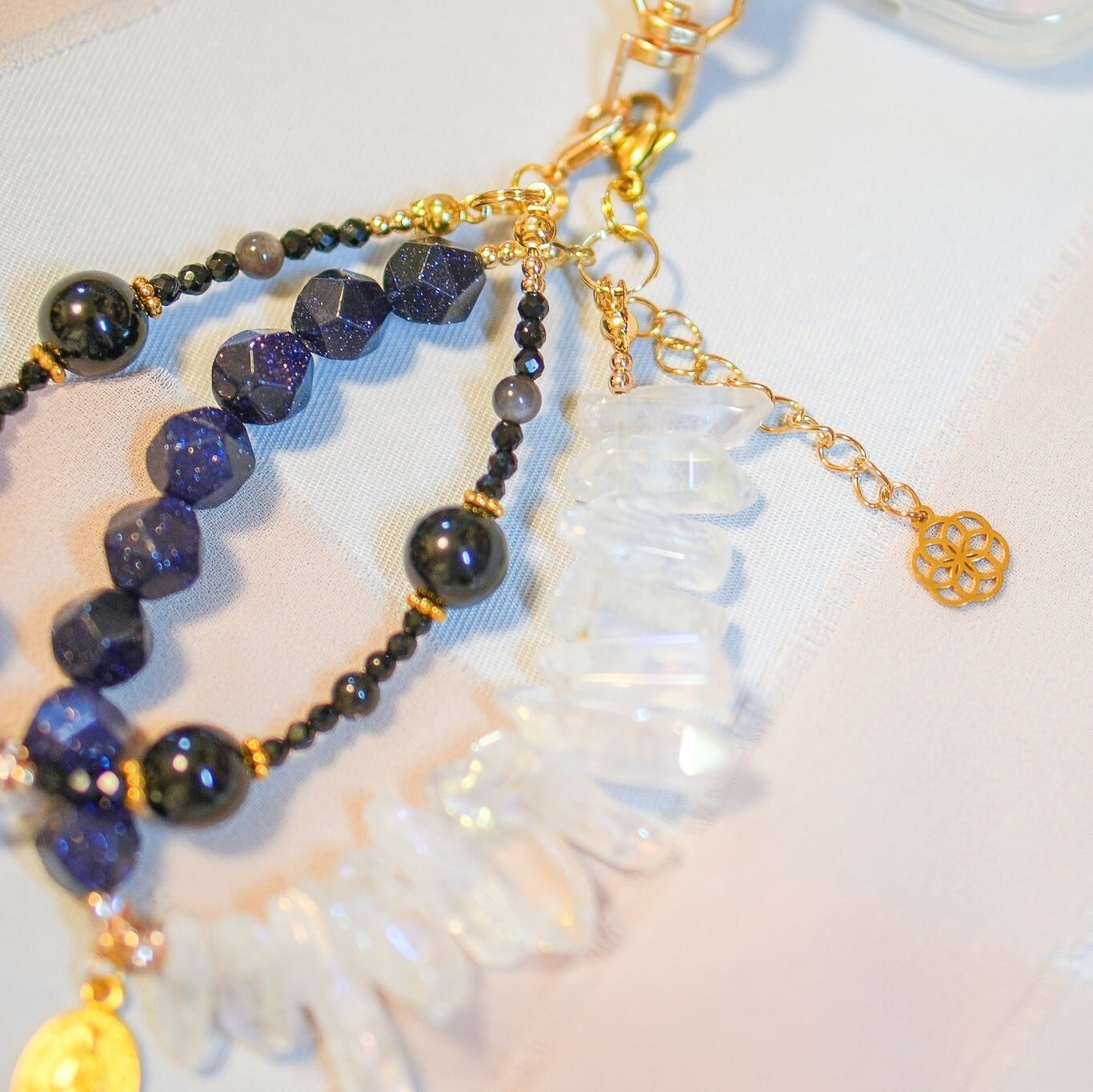 深いネイビーに星屑のような煌めきを秘めたサンドストーンをメインに、水晶の透明な輝き、漆黒のブラックオニキス、そしてモリオンやシルバーオブシディアンを重ねた、力強く荘厳なデザイン。