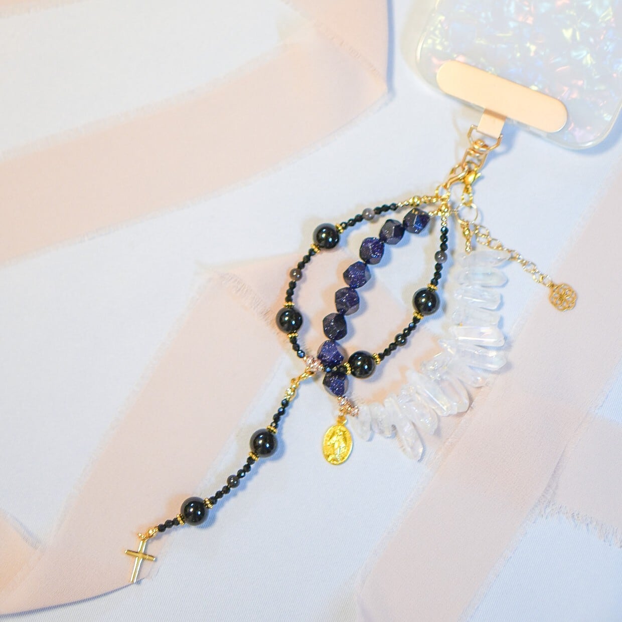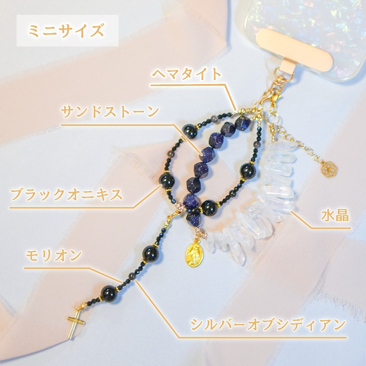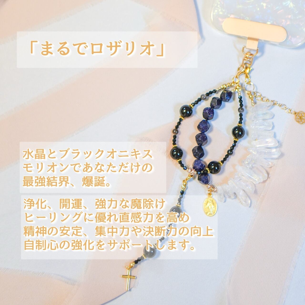 「スマホに宿す、漆黒の祈り。護りと力を宿す天然石ロザリオストラップ」ミニサイズ