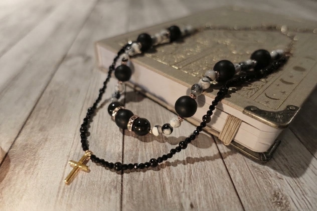 ブラックオニキス、ゴールデンオブシディアン、ファイヤーアゲート、モリオン、ヘマタイトを使用した守護ネックレスです。