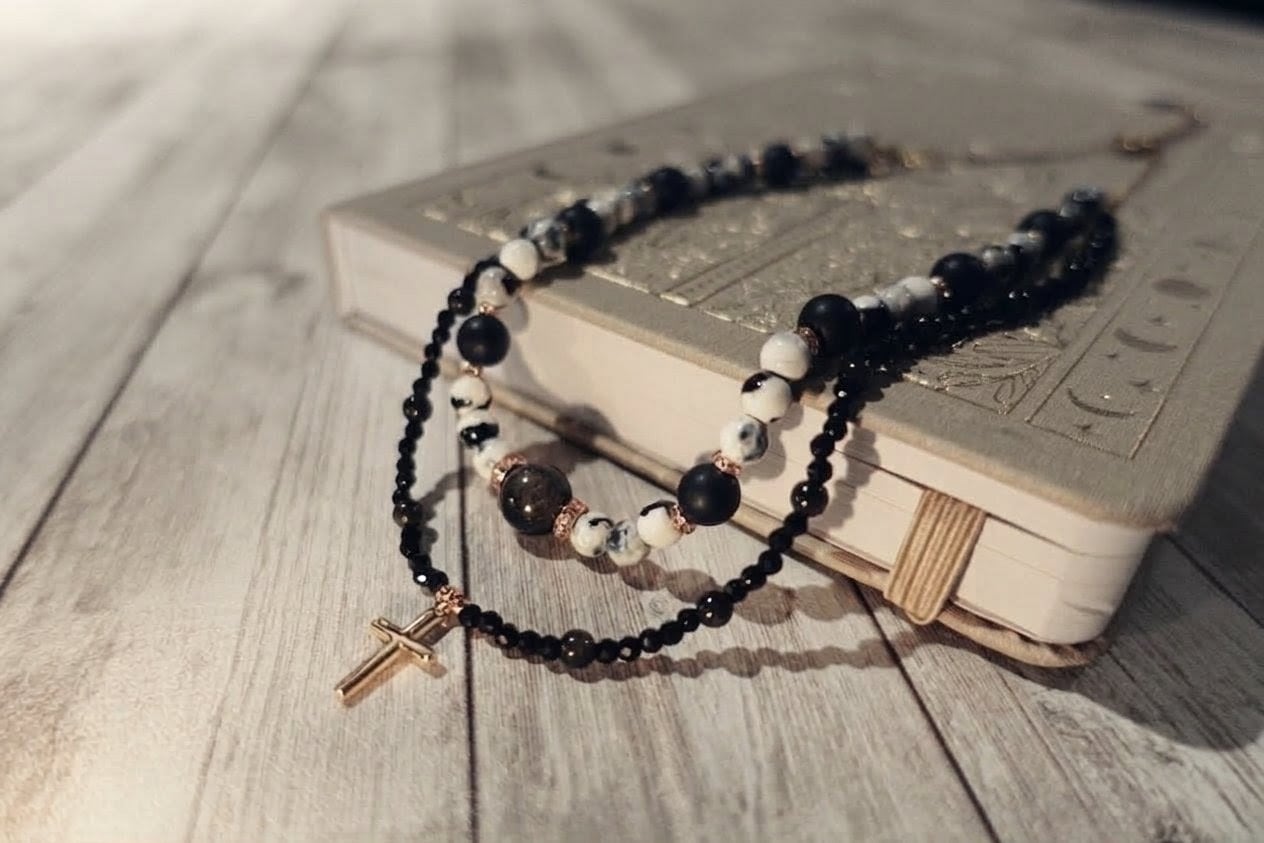 ブラックオニキス、ゴールデンオブシディアン、ファイヤーアゲート、モリオン、ヘマタイトを使用した守護ネックレスです。