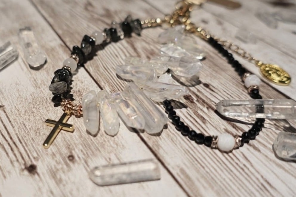 シックな黒と透明感のある白のコントラストに、クロスのチャームを添えて、まるでロザリオを思わせる荘厳なデザインに仕上げました。