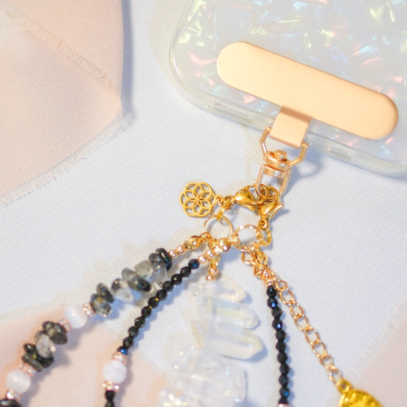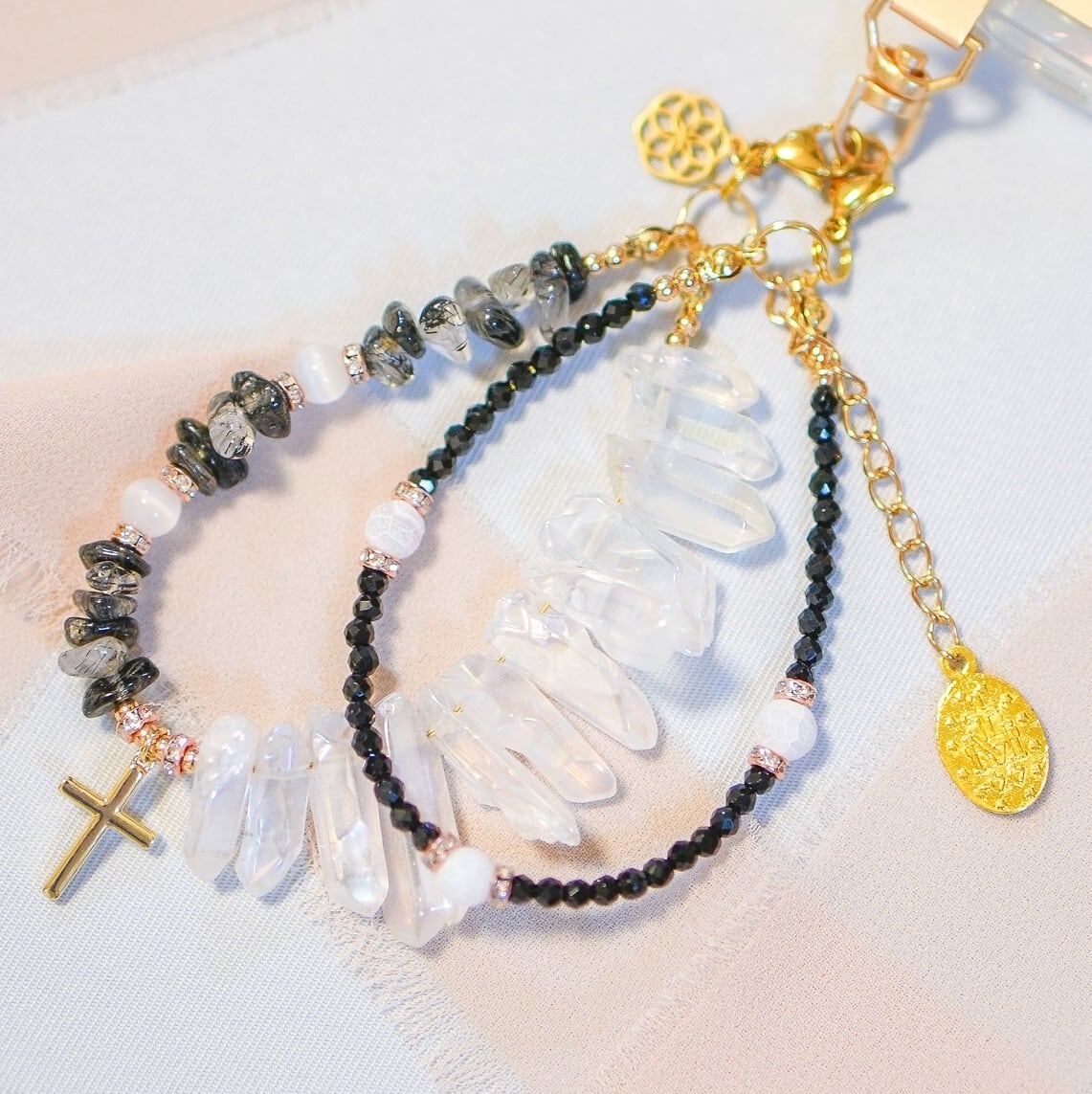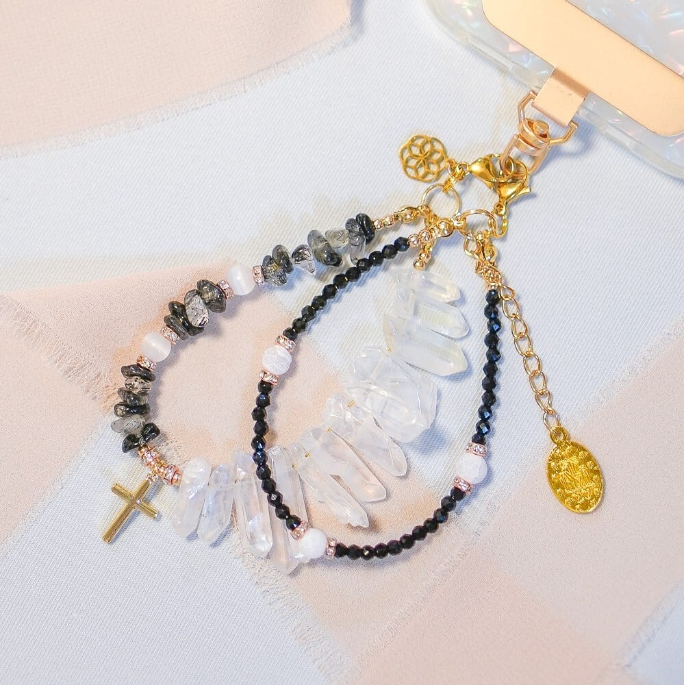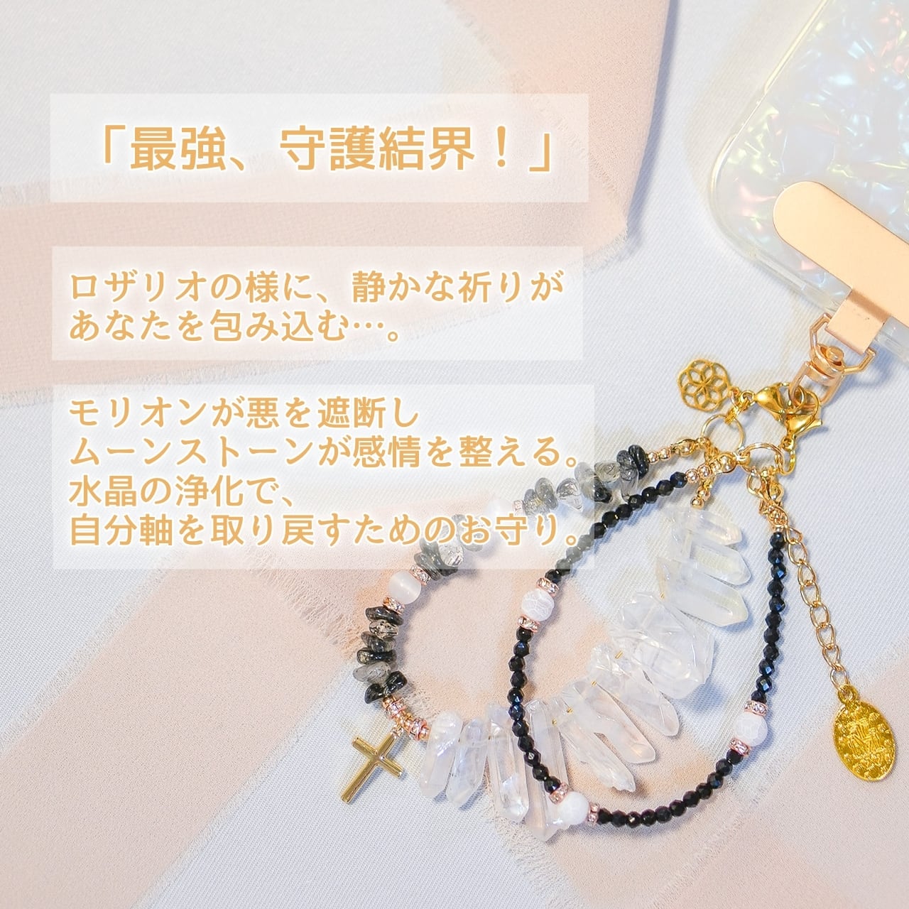 モリオンとブラックルチルクォーツ、つや消し瑪瑙、ムーンストーン、そして輝く水晶を組み合わせた、重厚感ある2連スマホストラップ。