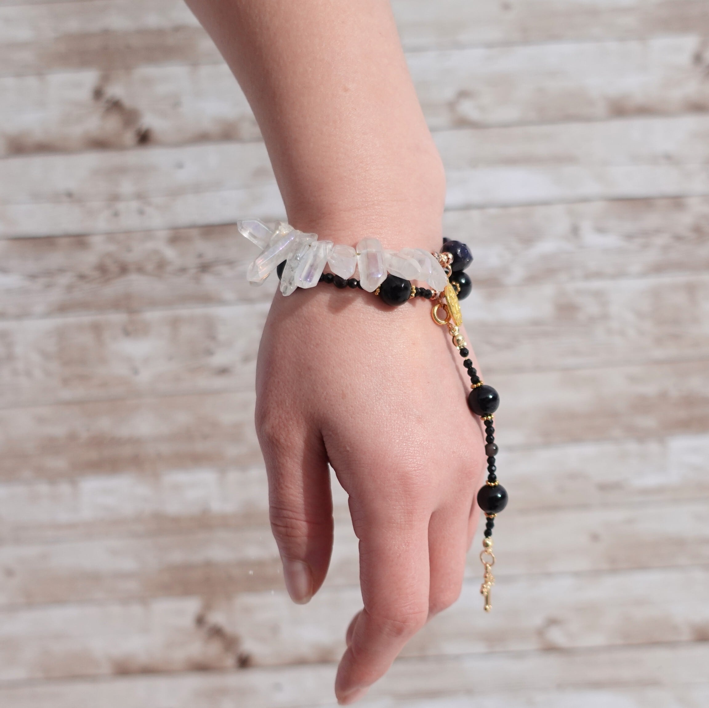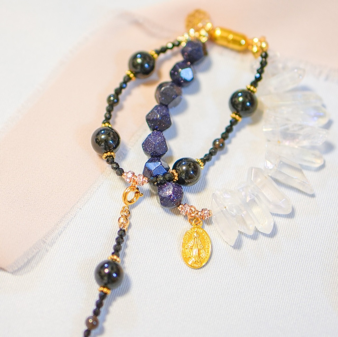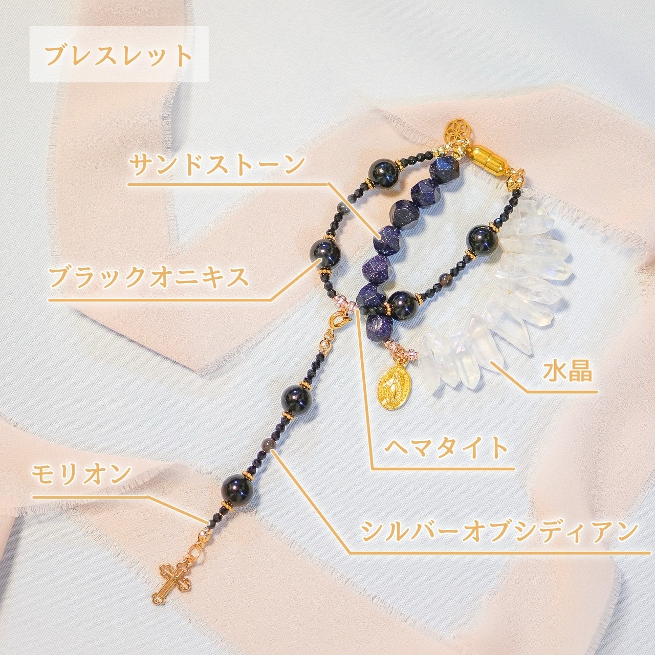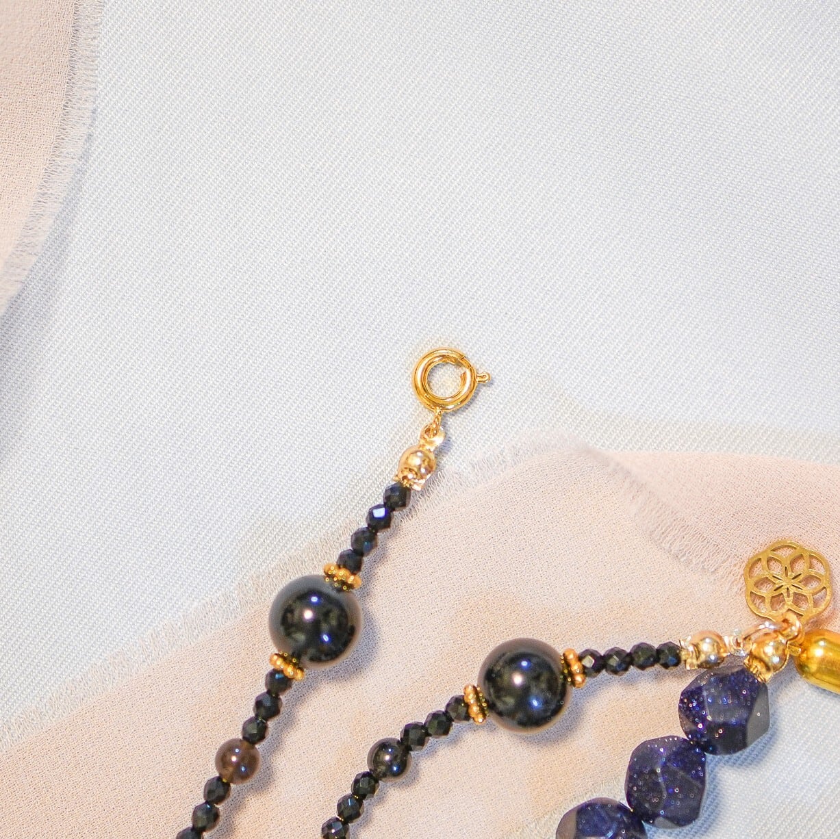 深いネイビーに星屑のような煌めきを秘めたサンドストーンをメインに、水晶の透明な輝き、漆黒のブラックオニキス、そしてモリオンやシルバーオブシディアンを重ねた、力強く荘厳なデザイン。