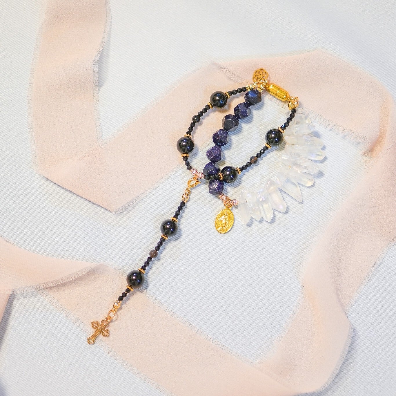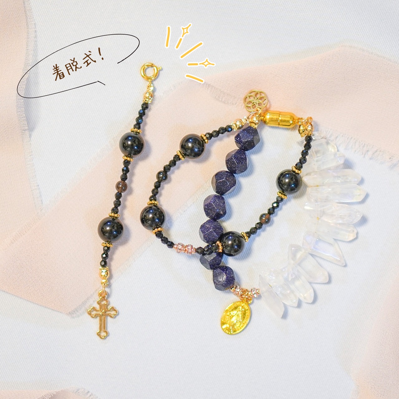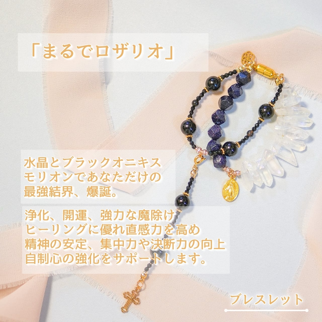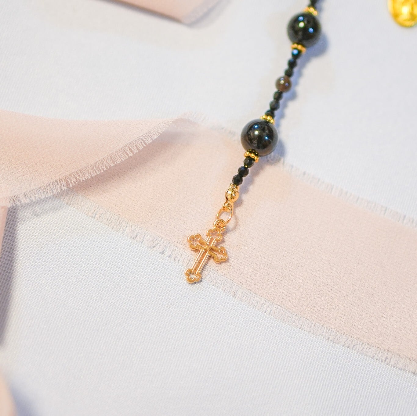 「スマホに宿す、漆黒の祈り。護りと力を宿す天然石ロザリオブレスレット」